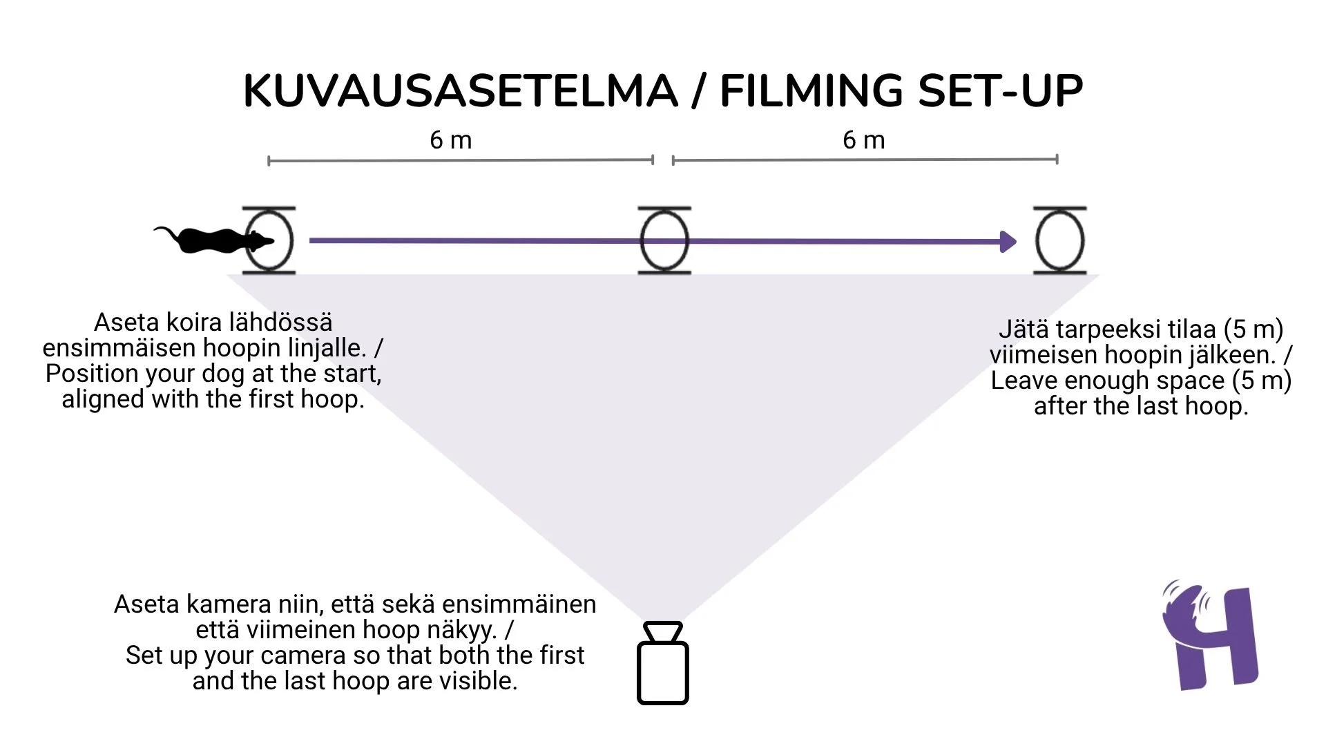 Aseta koirasi lähtöön ensimmäisen hoopin suorituslinjalle. Huomaa, että voit tarvittaessa käyttää avustajaa. / Position your dog at the start, aligned with the path through the first hoop. Note that you may use an assistant if needed.