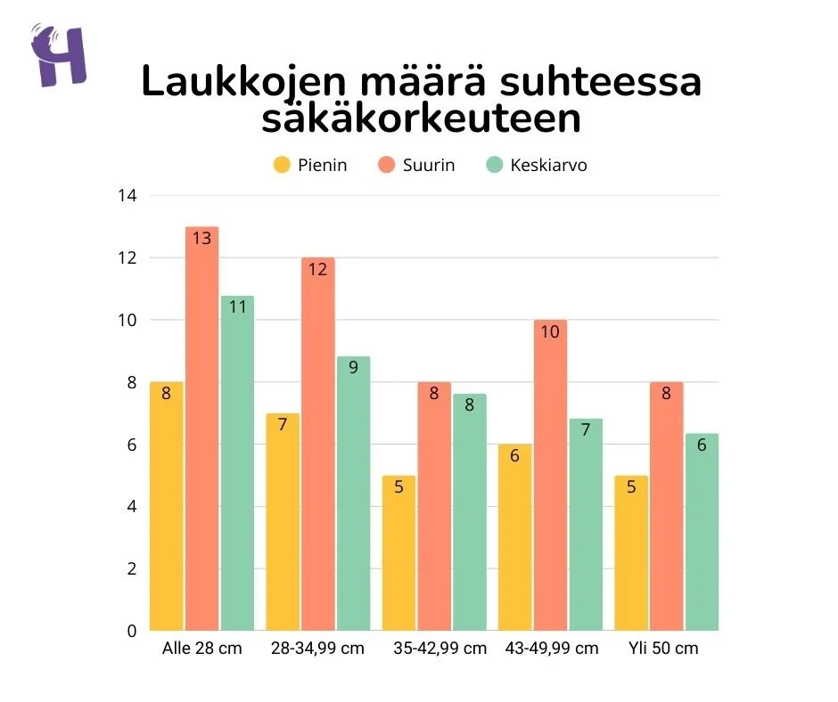 Laukkojen määrät vaihtelivat 4 ja 13 välillä. Laukkojen keskiarvo kaikista vastauksista on 7, joka on myös yleisin arvo kaikista vastauksista.