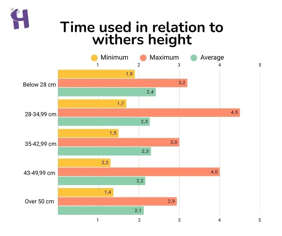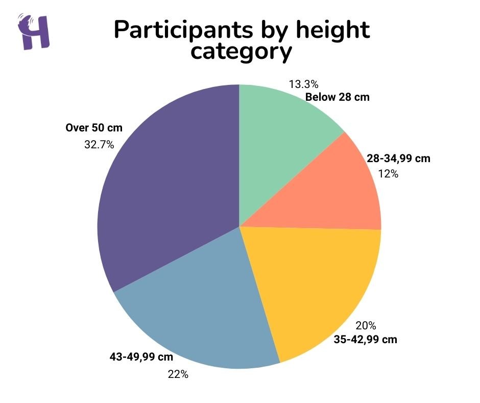 Of the respondents, 116 (about 77 percent) provided their dog’s exact height at the withers. The average height was 42 cm. The smallest participant measured 18 cm and the tallest 67 cm. One quarter of the participating dogs were under 35 cm tall and one quarter were over 52 cm tall.