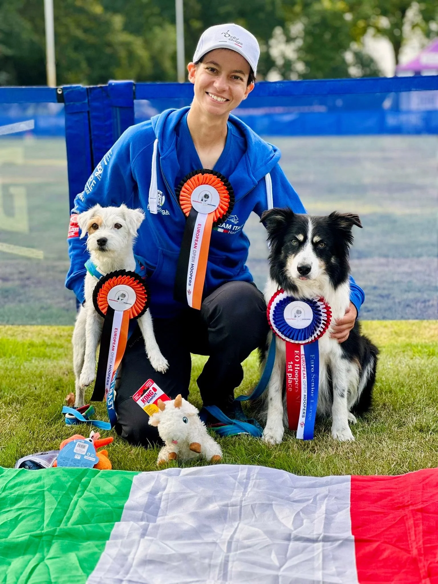 Renata with her dogs, Parson Wooper Looper and Border Collie Levi, at European Open.